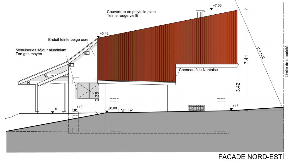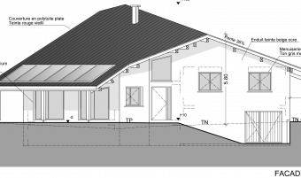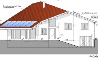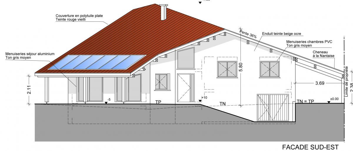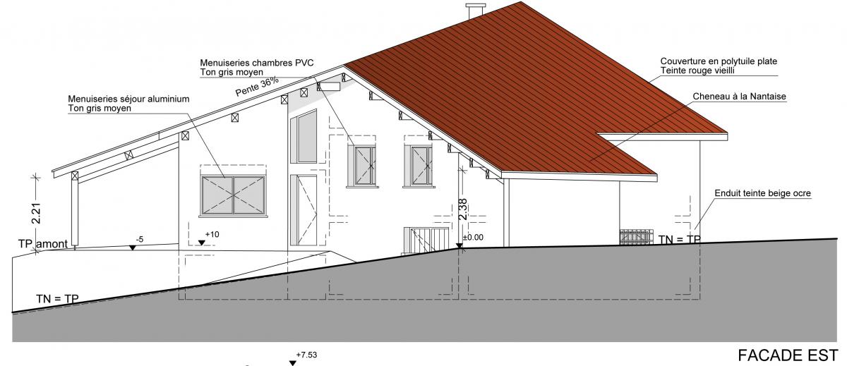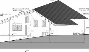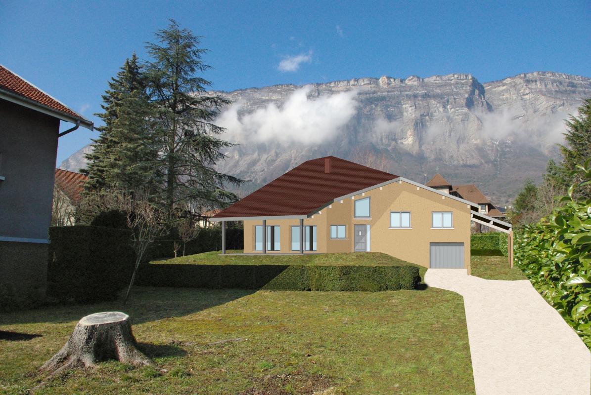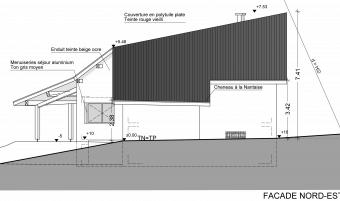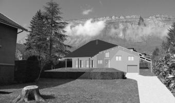 Le terrain sur lequel commence à s’ériger le projet de Mr et Mme J. est situé sur la commune de Montbonnot Saint Martin en Isère. Le choix du parti architectural est dicté par l’adéquation des contraintes liées au projet à savoir la prise en compte de la topographie avec épannelage du projet suivant courbe de niveau avec réglage du niveau noble au terrain naturel permettant continuité de la terrasse sur le terrain. La maison est constituée d’un volume en forme de L, réglé en angle de 125° profitant pleinement de l’orientation Sud, supportant sur le pan de toiture Sud des panneaux photovoltaïques. L’architecture répond à son environnement par l’emploi de lignes simples et épurées, de percements suivant la course du soleil et l’emploi de matériaux BBC (polytuile...). Le Maître d’Ouvrage désirait une maison aux matériaux essentiellement HQE. Il s’est impliqué dans la construction de cette maison par les différents coffrages.