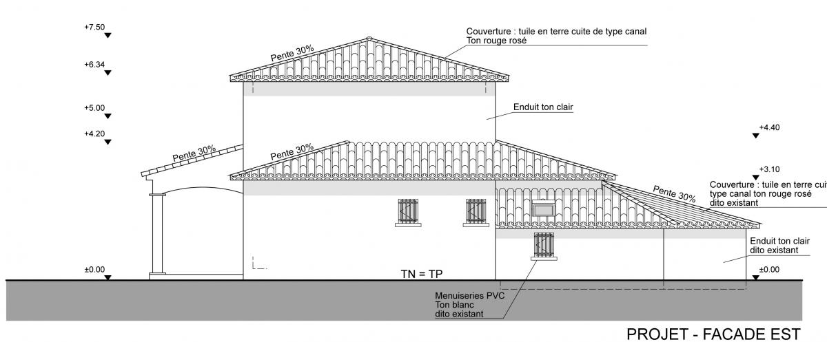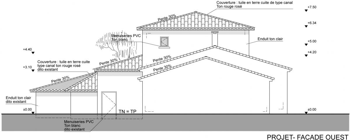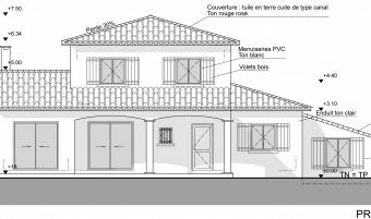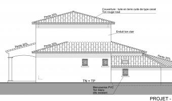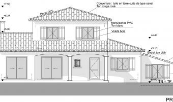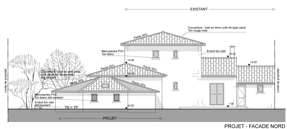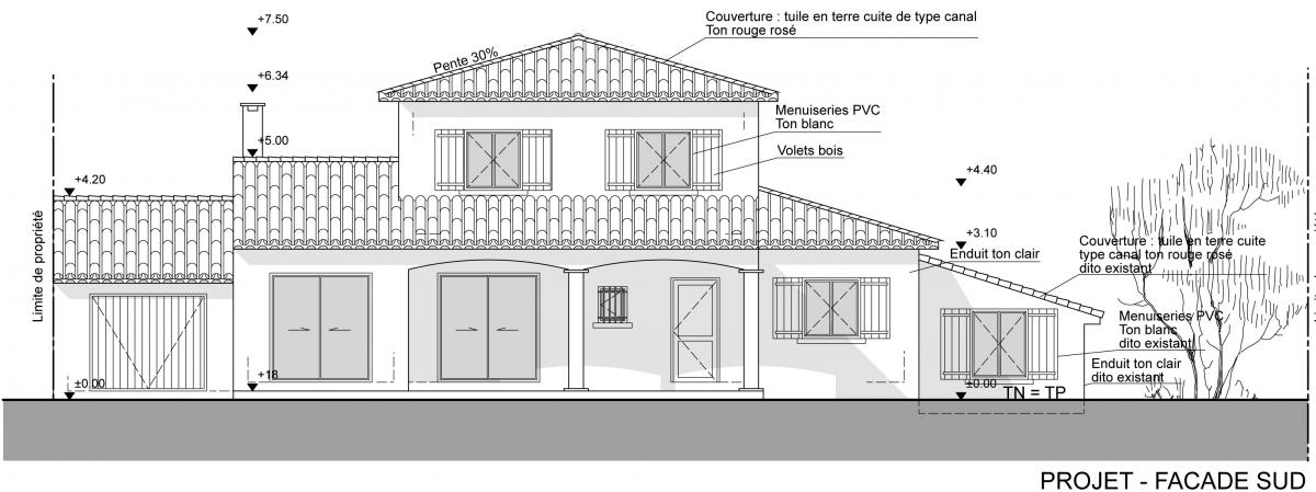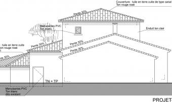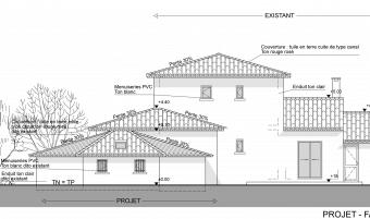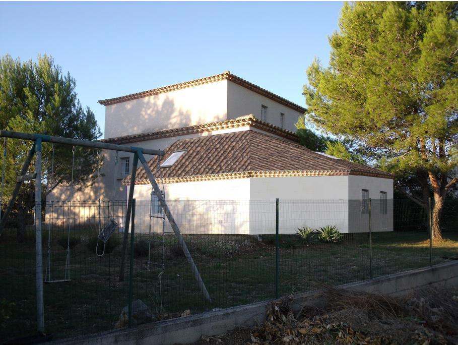 La maison et la parcelle formant le projet d’extension sont situées sur la commune de Saint Gély du Fesc, à proximité de Montpellier, dans l’Hérault. Le projet consiste en l’extension de la maison existante en structure bois avec isolation par l’extérieur pour celle-ci dans un souci d’économie d’énergie. L’extension permet l’agrandissement d’une chambre, la création d’une cinquième chambre et d’un atelier pour le jardinage. Les 3 pièces de l’extension se situent en dessous du terrain naturel en raison de l’accroche de la toiture du projet à 5 pans sous la toiture existante (et prolongée) formant ensemble cohérent. Cette forme particulière de l’extension est due au cahier des charges mais aussi au pin existant dont les Maîtres d’Ouvrage ne voulaient se séparer.