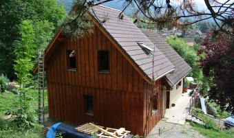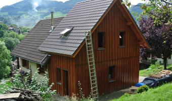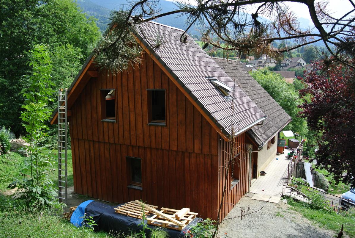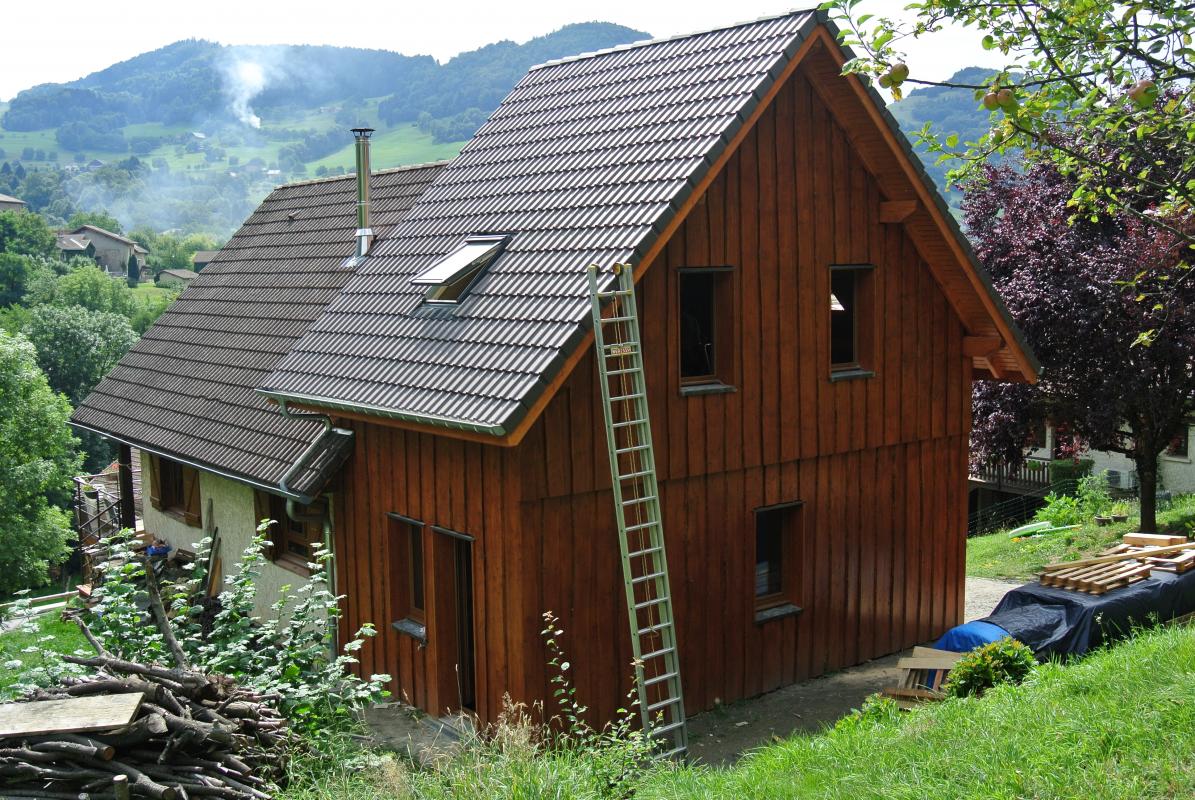 Le projet est construit en ossature bois avec bardage vertical de même teinte que le bâti existant c'est à dire en chêne moyen. La toiture à deux pans de pente similaire à l'existant est relevée d'un mètre pour agrandir la hauteur de l'étage par rapport à l'existant. Elle est surmontée de deux velux éclairant naturellement les deux chambres.